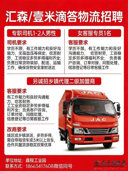 工作描述:城區(qū)或鄉(xiāng)鎮(zhèn)派送,多勞多得,需自帶車輛(箱貨車或3米以上貨車)。